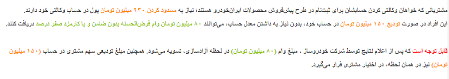 برای ثبت‌نام در طرح‌های پیش‌فروش خودروهای ایران خودرو، مشتریان گرامی موظف به وکالتی کردن مبلغ ۲۳۰ میلیون تومان در حساب‌های مشخص شده می‌باشند. این اقدام به منظور اطمینان از جدیت متقاضیان و تسریع در روند فروش خودروها انجام می‌شود. خبر خوب این است که ایران خودرو تسهیلاتی را برای متقاضیان در نظر گرفته است. با واریز مبلغ ۱۵۰ میلیون تومان به حساب وکالتی، مشتریان می‌توانند از وام قرض‌الحسنه‌ای به ارزش ۸۰ میلیون تومان بهره‌مند شوند.